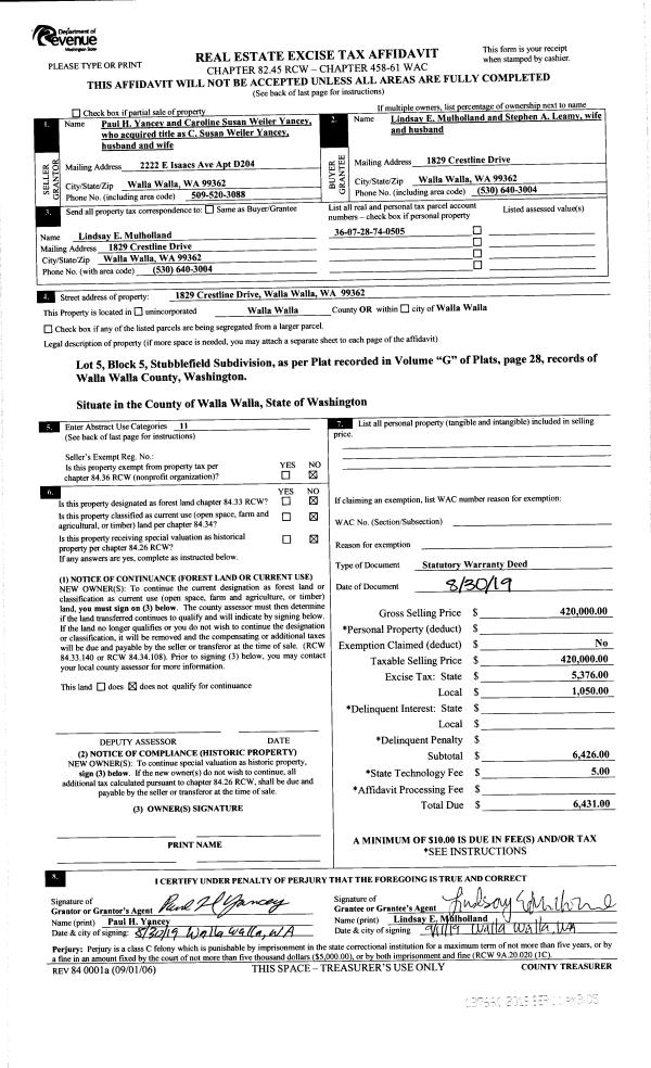 | 2 | 09/11/2019 | SWD | STATUTORY WARRANTY DEED | YANCEY PAUL H | LINDSAY E MULHOLLAND | | | $420,000.00 | 137660 | 2019-0707 |
