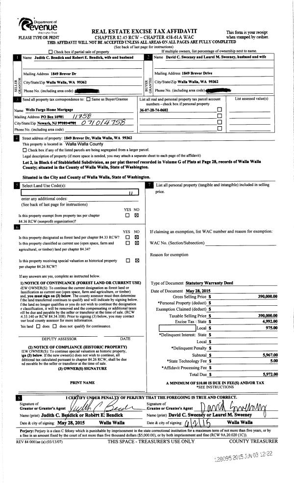 | 2 | 06/03/2015 | SWD | STATUTORY WARRANTY DEED | BENDICK ROBERT E & JUDITH C | SWEENEY DAVID C & LAUREL M | | | $390,000.00 | 128095 | 2015-04683 |
