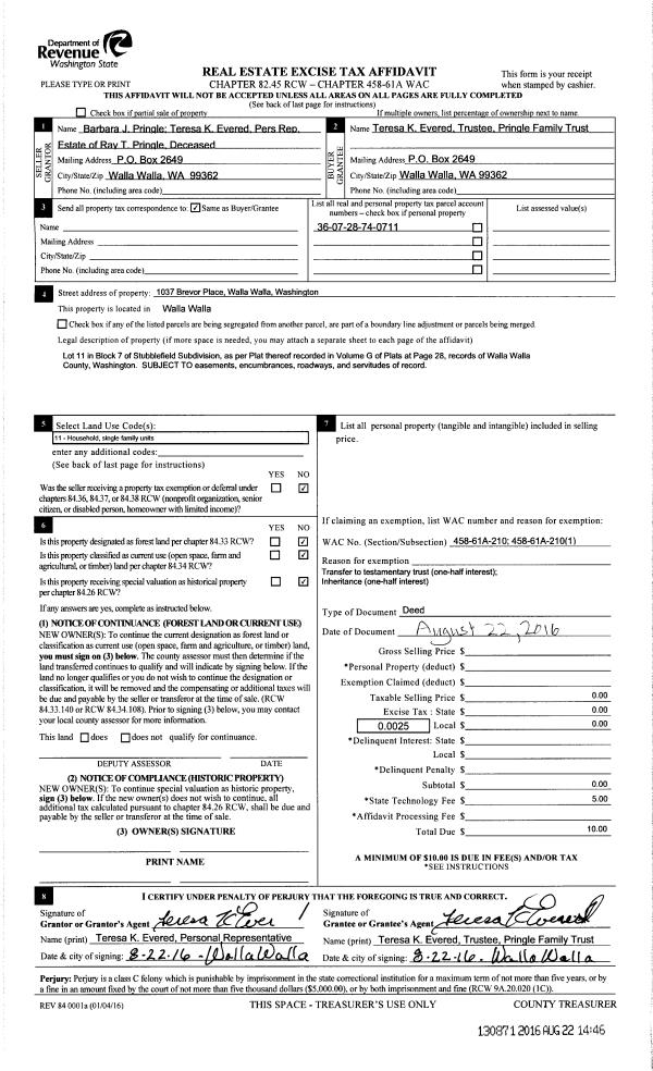 | 2 | 08/22/2016 | DEED | DEED | PRINGLE RAY T | PRINGLE FAMILY TRUST | | | $0.00 | 130871 | 2016-06731 |