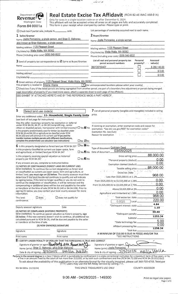 | 1 | 04/29/2025 | QCD | QUIT CLAIM DEED | POMRANING JOELLE | POMRANING JOELLE | | | | 149300 | 2025-02288 |
