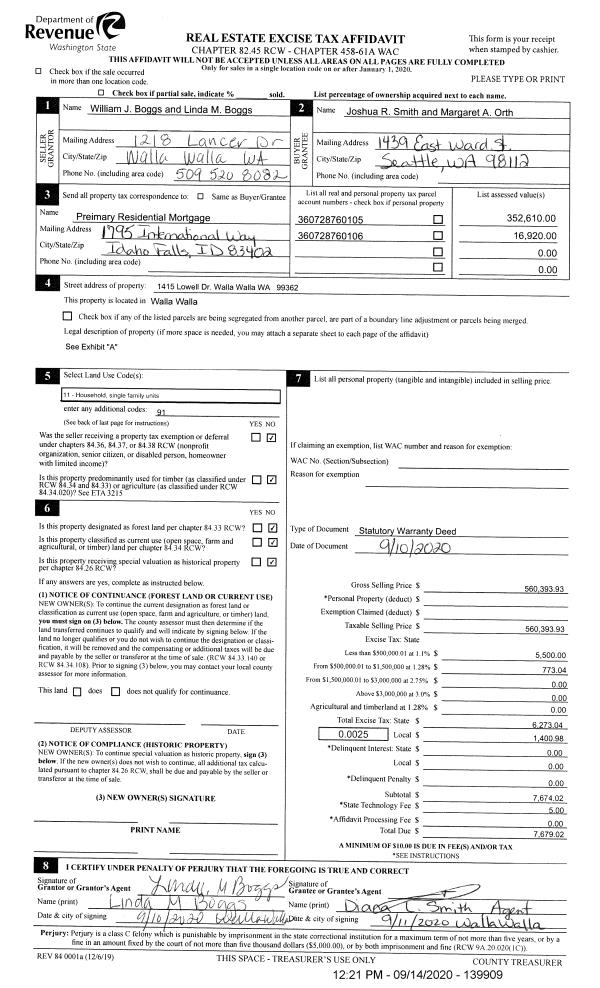 | 1 | 09/14/2020 | SWD | STATUTORY WARRANTY DEED | BOGGS WILLIAM J & LINDA M | SMITH JOSHUA R & MARGARET A ORTH | | 2-PARCELS | $560,394.00 | 139909 | 2020-09321 |