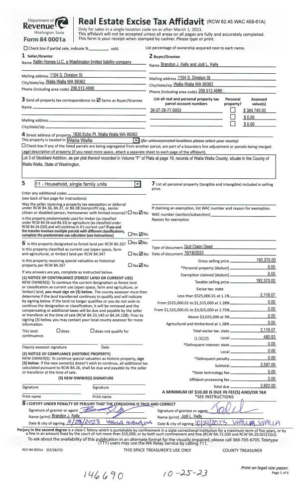 | 1 | 10/31/2023 | QCD | QUIT CLAIM DEED | | KELLY BRANDON J & JODI | | | | 146690 | 2023-06369 |