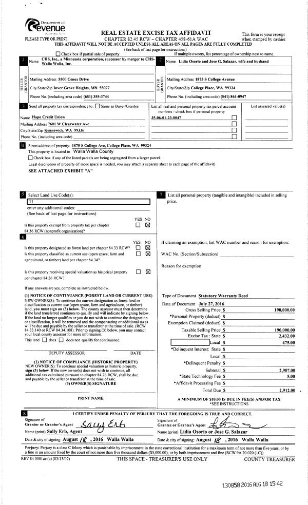| 2 | 08/18/2016 | SWD | STATUTORY WARRANTY DEED | WALLA WALLA FARMERS CO-OP | SALAZAR JOSE G | | | $190,000.00 | 130858 | 2016-06610 |