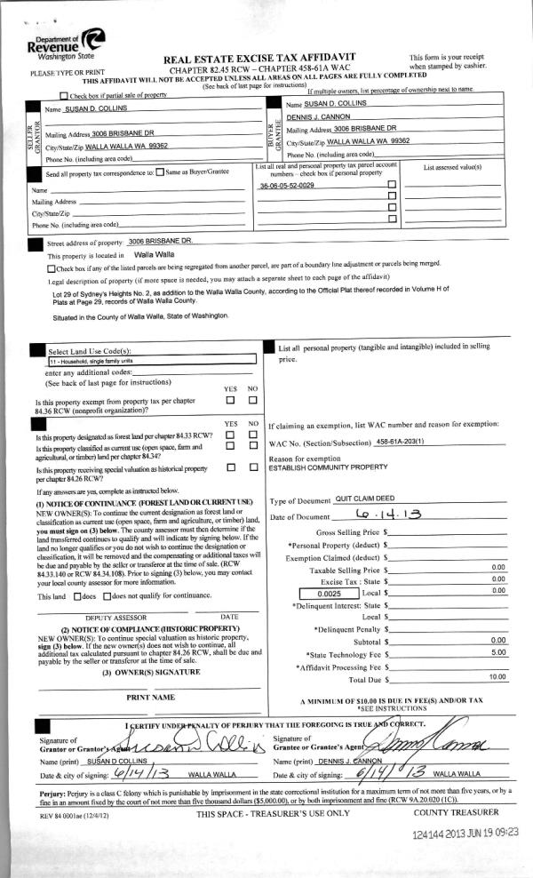 | 3 | 06/19/2013 | QCD | QUIT CLAIM DEED | COLLINS, SUSAN D | CANNON, DENNIS J | | | $0.00 | 124144 | 2013-06121 |