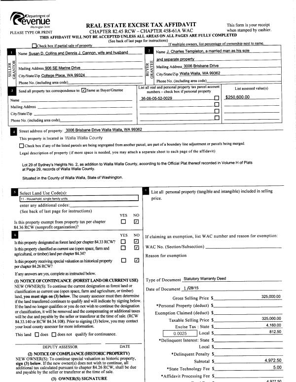 | 2 | 02/02/2015 | SWD | STATUTORY WARRANTY DEED | CANNON DENNIS J | TEMPLETON J CHARLES | | | $325,000.00 | 127374 | 2015-00971 |
