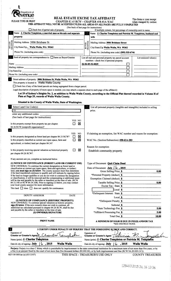 | 1 | 07/16/2015 | QCD | QUIT CLAIM DEED | TEMPLETON J CHARLES | TEMPLETON J CHARLES & PATRICIA M | | | $0.00 | 128403 | 2015-06083 |