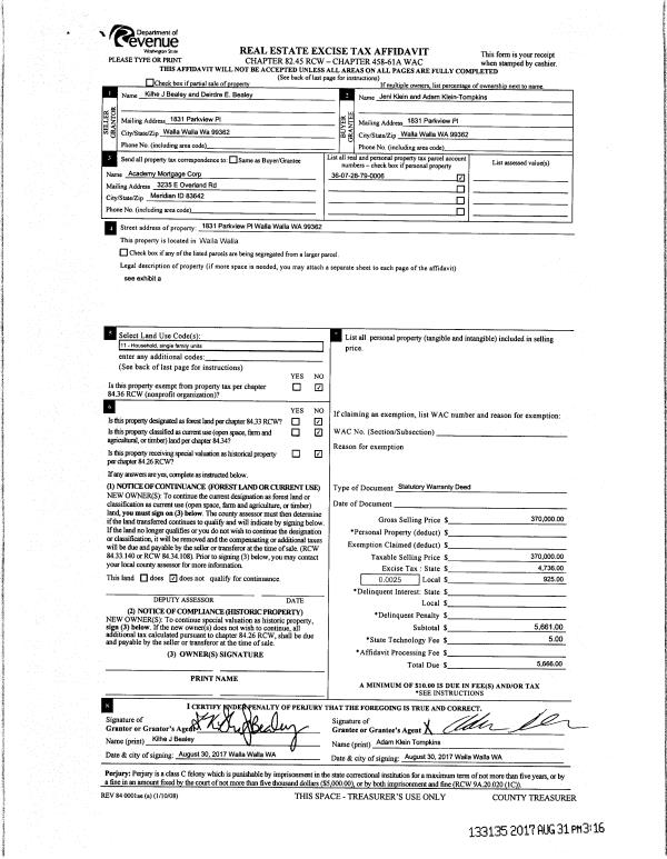 | 1 | 08/31/2017 | SWD | STATUTORY WARRANTY DEED | BEALEY KILHE J & DEIRDRE E | KLEIN JENI L | | | $370,000.00 | 133135 | 2017-06866 |