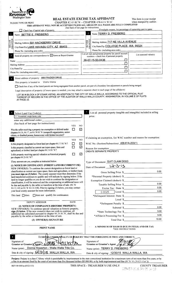 | 3 | 01/05/2016 | QCD | QUIT CLAIM DEED | FREIBERG BETTIE E | FREIBERG TERRY | | | | 129453 | 2016-00085 |
