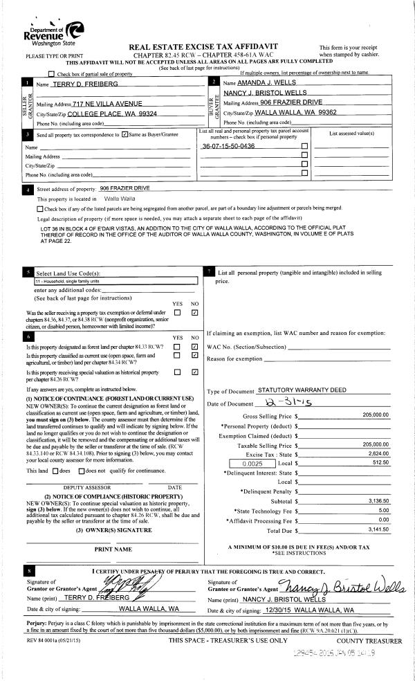 | 2 | 01/05/2016 | SWD | STATUTORY WARRANTY DEED | FREIBERG TERRY | WELLS AMANDA J | | | $205,000.00 | 129454 | 2016-00086 |