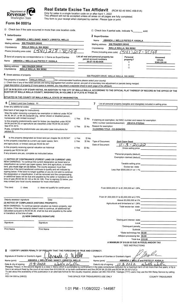 | 1 | 11/03/2022 | QCD | QUIT CLAIM DEED | WELLS AMANDA J | WELLS AMANDA J & PISTEO P KASALA | | | $0.00 | 144987 | 2022-09005 |