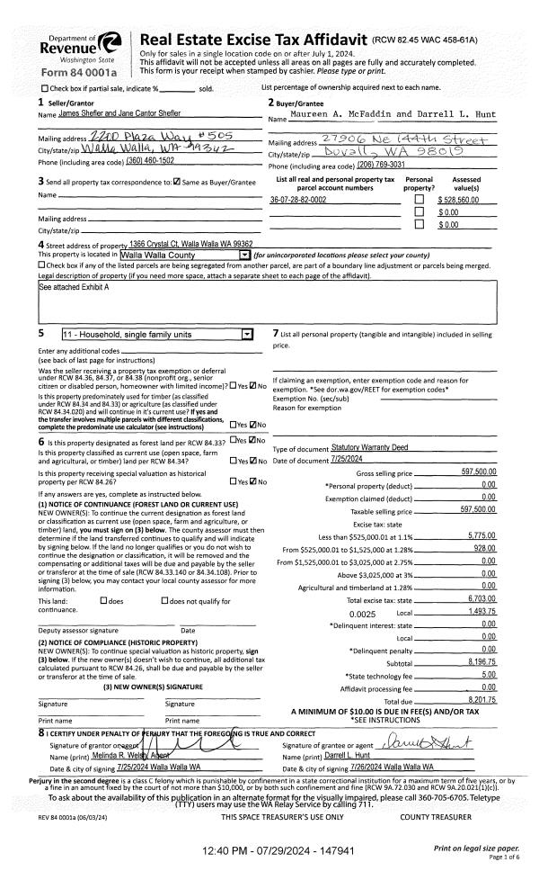 | 1 | 07/29/2024 | SWD | STATUTORY WARRANTY DEED | SHEFLER JAMES L & JANE CANTOR SHEFLER | MCFADDIN MAUREEN A & DARRELL L HUNT | | | $597,500.00 | 147941 | 2024-04106 |