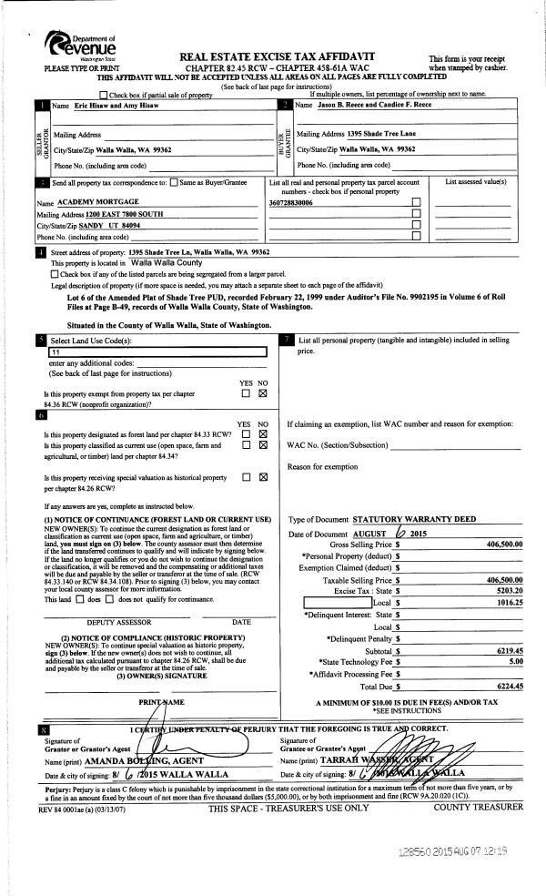 | 3 | 08/07/2015 | SWD | STATUTORY WARRANTY DEED | HISAW ERIC & AMY | REECE JASON B & CANDICE F | | | $406,500.00 | 128560 | 2015-06848 |