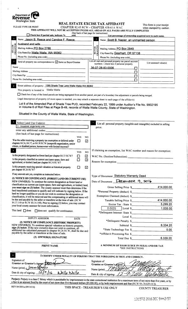 | 2 | 12/09/2016 | SWD | STATUTORY WARRANTY DEED | REECE JASON B & CANDICE F | NAPIER SCOTT B | | | $414,000.00 | 131572 | 2016-10139 |