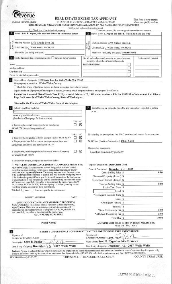 | 1 | 12/12/2017 | QCD | QUIT CLAIM DEED | NAPIER SCOTT B | NAPIER SCOTT B | | | $0.00 | 133789 | 2017-10043 |