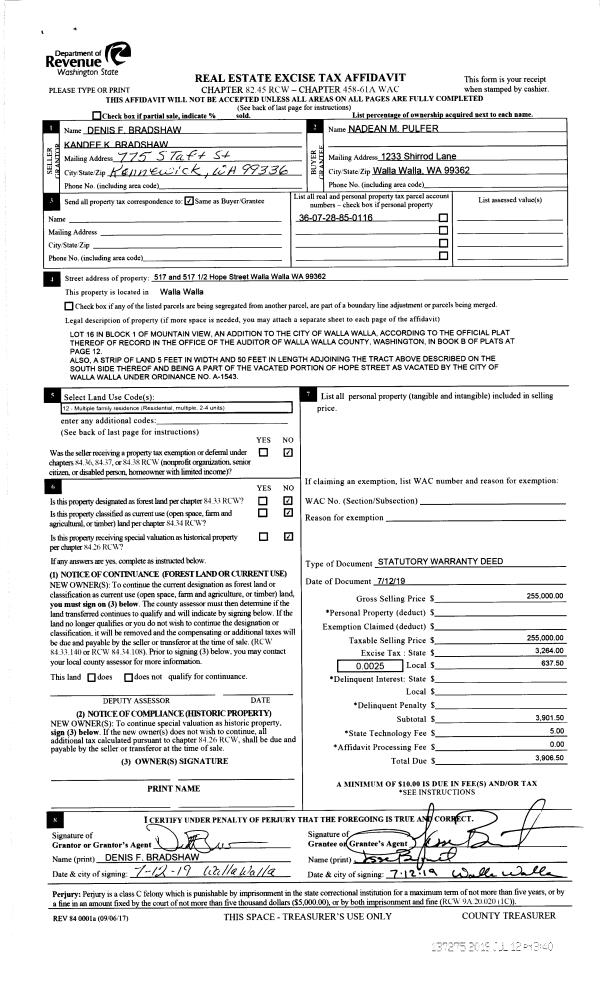 | 2 | 07/12/2019 | SWD | STATUTORY WARRANTY DEED | BRADSHAW DENIS & KANDEE | PULFER NADEAN MARIE | | | $255,000.00 | 137275 | 2019-05007 |