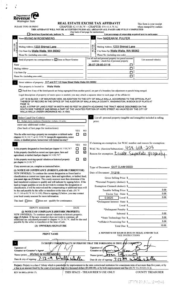 | 1 | 07/12/2019 | QCD | QUIT CLAIM DEED | ROSENBERG IRVING M | PULFER NADEAN MARIE | | | | 137276 | 2019-05008 |