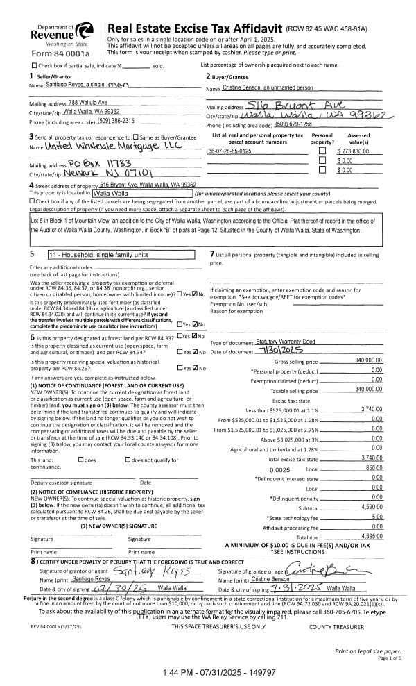 | 1 | 07/31/2025 | SWD | STATUTORY WARRANTY DEED | REYES SANTIAGO | BENSON CRISTINE | | | $340,000.00 | 149797 | 2025-04485 |