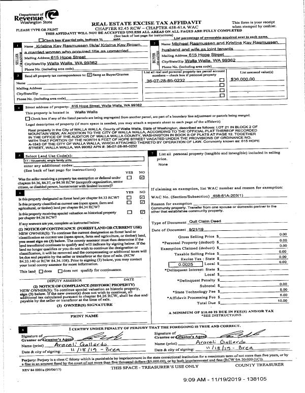 | 1 | 09/21/2019 | QCD | QUIT CLAIM DEED | BROWN KRISTINA KAY | RASMUSSEN MICHAEL & KRISTINA KAY | | | $0.00 | 138105 | 2019-09547 |