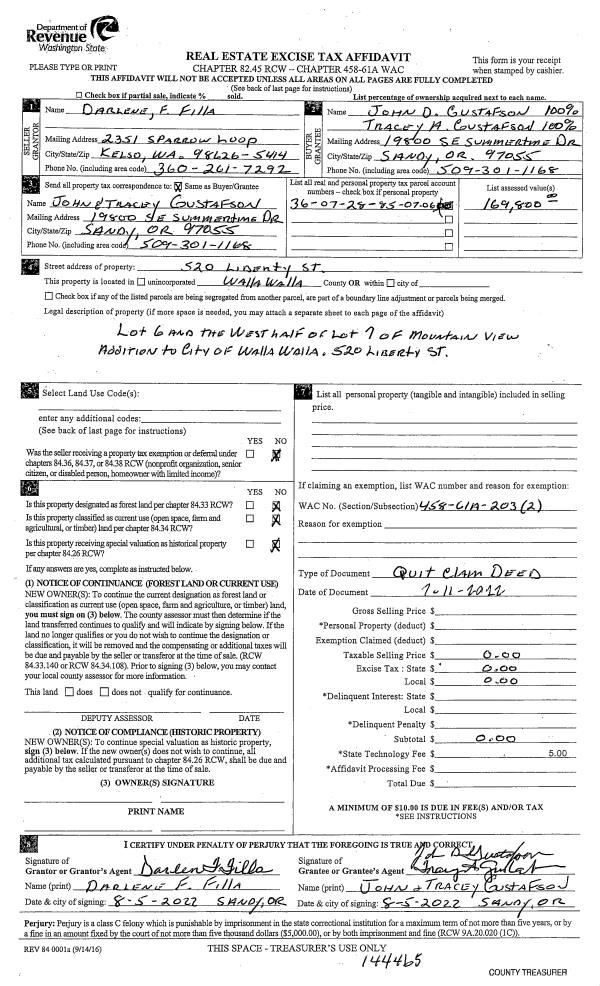 | 2 | 08/08/2022 | QCD | QUIT CLAIM DEED | FILLA DARLENE F LIVING TRUST | GUSTAFSON JOHN & TRACEY | | | | 144465 | 2022-06614 |