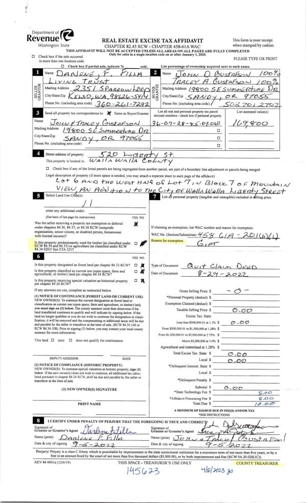 | 1 | 04/08/2023 | QCD | QUIT CLAIM DEED | FILLA DARLENE F LIVING TRUST | GUSTAFSON JOHN & TRACEY | | | | 145623 | 2023-01777 |