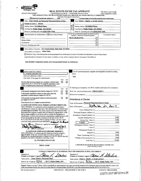 | 2 | 09/21/2017 | DPR | DEED OF PERSONAL REPRESENTATIVE | STERLIN JERRY L & CHERI L | STERLIN CHERI L | | | $0.00 | 133270 | 2017-07493 |