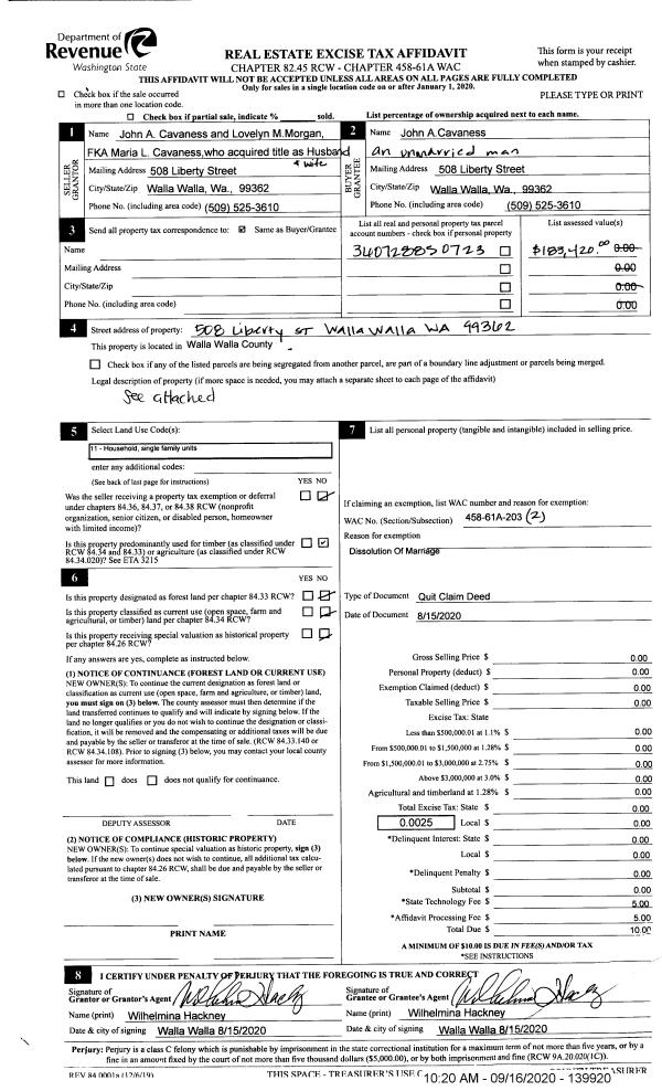 | 1 | 09/16/2020 | QCD | QUIT CLAIM DEED | CAVANESS JOHN A & MARIA L | CAVANESS JOHN A | | | | 139920 | 2020-09462 |