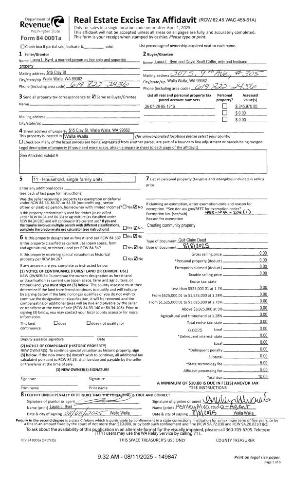 | 1 | 08/11/2025 | QCD | QUIT CLAIM DEED | BYRD LAURA L | BYRD LAURA L & DAVID SCOTT COFFIN | | | | 149847 | 2025-04726 |