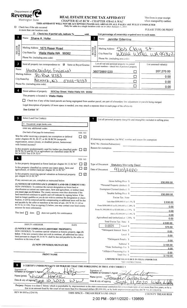 | 1 | 09/11/2020 | SWD | STATUTORY WARRANTY DEED | HOFER SHANE A | GILLENTINE JENNIFER | | | $230,000.00 | 139899 | 2020-09272 |