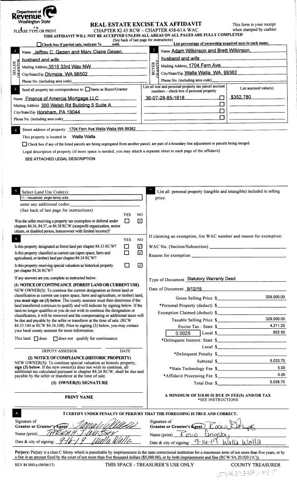 | 2 | 09/16/2019 | SWD | STATUTORY WARRANTY DEED | GEGEN JEFFREY C & MARY CLAIRE | WILKINSON ADAM & BRETT | | | $329,000.00 | 137686 | 2019-07185 |