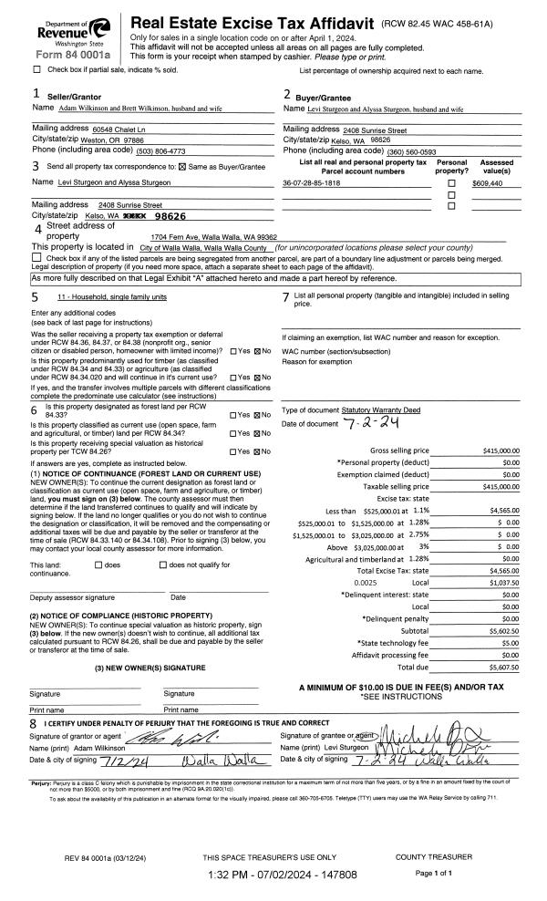 | 1 | 07/02/2024 | SWD | STATUTORY WARRANTY DEED | WILKINSON ADAM & BRETT | STURGEON LEVI & ALYSSA | | | $415,000.00 | 147808 | 2024-03552 |