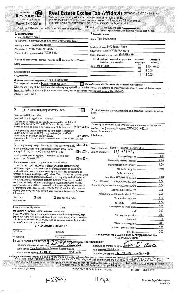 | 1 | 11/15/2021 | DPR | DEED OF PERSONAL REPRESENTATIVE | AUSTIN NANCY GAIL ESTATE OF | AUSTIN TODD DAVID | | | $0.00 | 142875 | 2021-13613 |