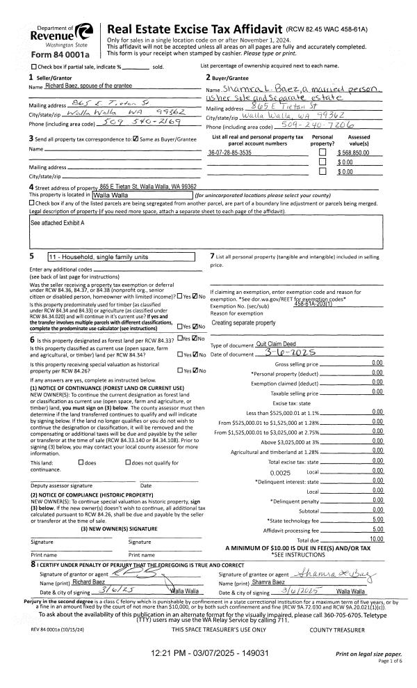 | 1 | 03/07/2025 | QCD | QUIT CLAIM DEED | BAEZ RICHARD & SHAMRA L | BAEZ SHAMRA L | | | | 149031 | 2025-01193 |