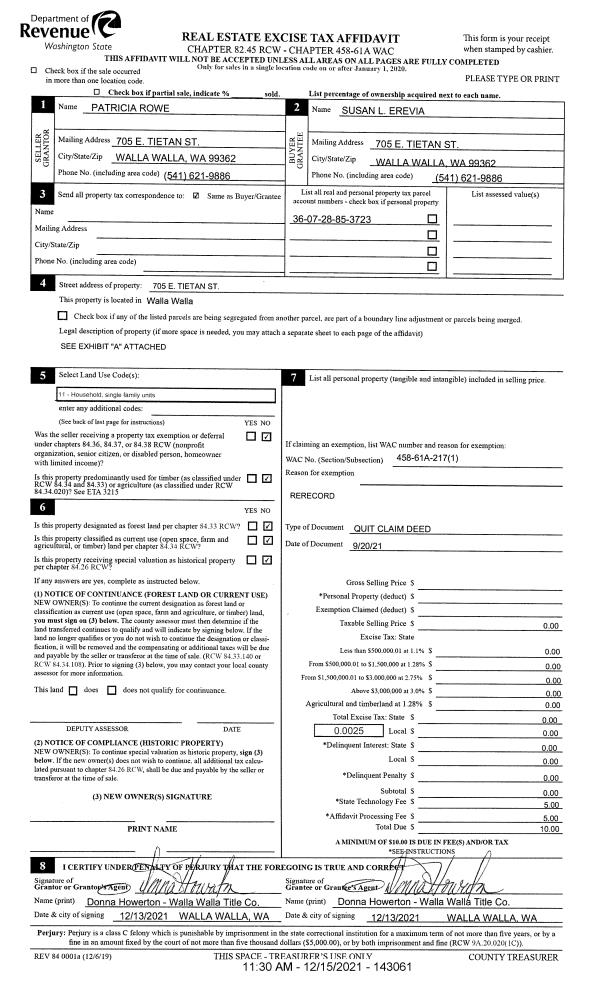 | 2 | 09/24/2021 | QCD | QUIT CLAIM DEED | EREVIA SUSAN | EREVIA SUSAN L | | | $0.00 | 142546 | 2021-11693 |