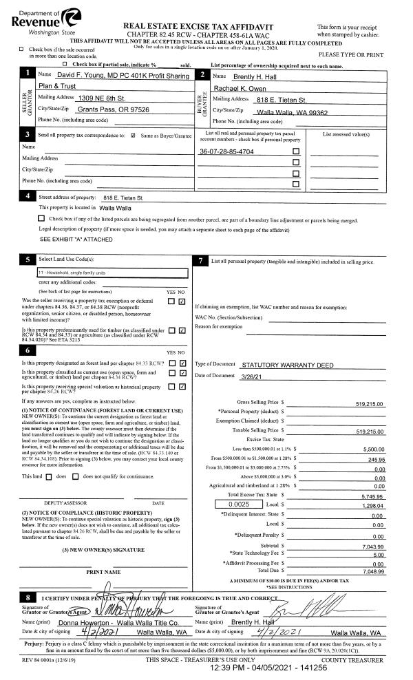 | 1 | 04/05/2021 | SWD | STATUTORY WARRANTY DEED | DAVID F YOUNG MD PC 401K | HALL BRENTLY H & RACHAEL K OWEN | | | $519,215.00 | 141256 | 2021-03909 |