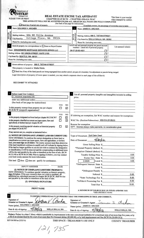 | 2 | 04/30/2012 | QCD | QUIT CLAIM DEED | ARCHER, DOLORES V | ARCHER, JAMES S | | | | 121735 | 2012-03469 |