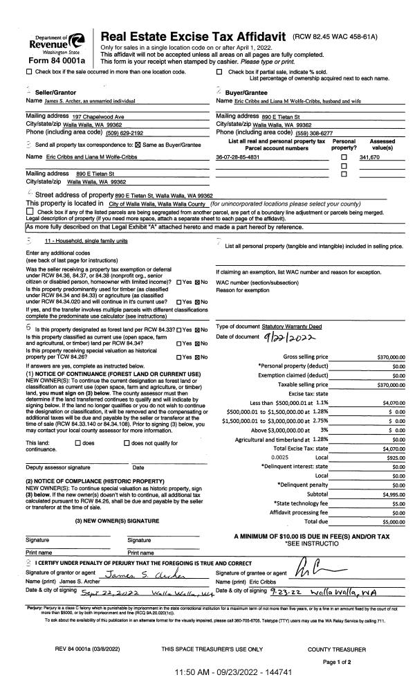 | 1 | 09/23/2022 | SWD | STATUTORY WARRANTY DEED | ARCHER JAMES S | CRIBBS ERIC & LIANA M WOLFE-CRIBBS | | | $370,000.00 | 144741 | 2022-07943 |