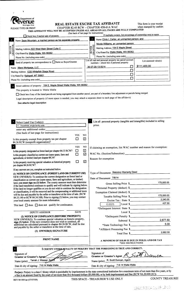 | 1 | 07/09/2014 | SWD | STATUTORY WARRANTY DEED | MOUNTAIN SEAN | CARTER CHRIS I | | | $175,000.00 | 126219 | 2014-04760 |