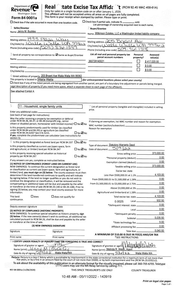 | 2 | 05/11/2022 | SWD | STATUTORY WARRANTY DEED | BUCKLEY JENNY M | WILKINSON ESTATES LLC | | | $373,000.00 | 143919 | 2022-03998 |