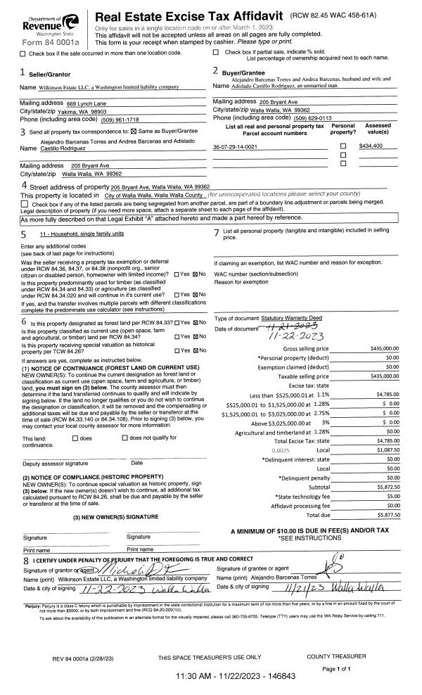| 1 | 11/22/2023 | SWD | STATUTORY WARRANTY DEED | WILKINSON ESTATES LLC | TORRES ALEJANDRO BARCENAS & ANDREA BARCENAS | | | $435,000.00 | 146843 | 2023-06825 |