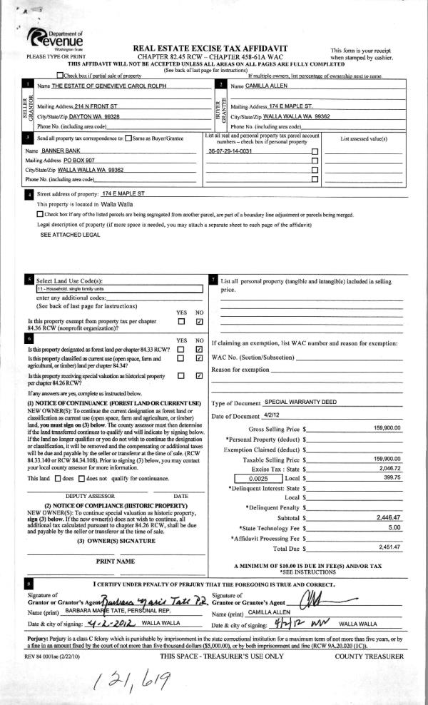 | 2 | 04/04/2012 | WARRANTY D | WARRANTY DEED | ROLPH, GENEVIEVE CAROL ESTATE | ALLEN, CAMILLA | | | $159,900.00 | 121619 | 2012-02692 |