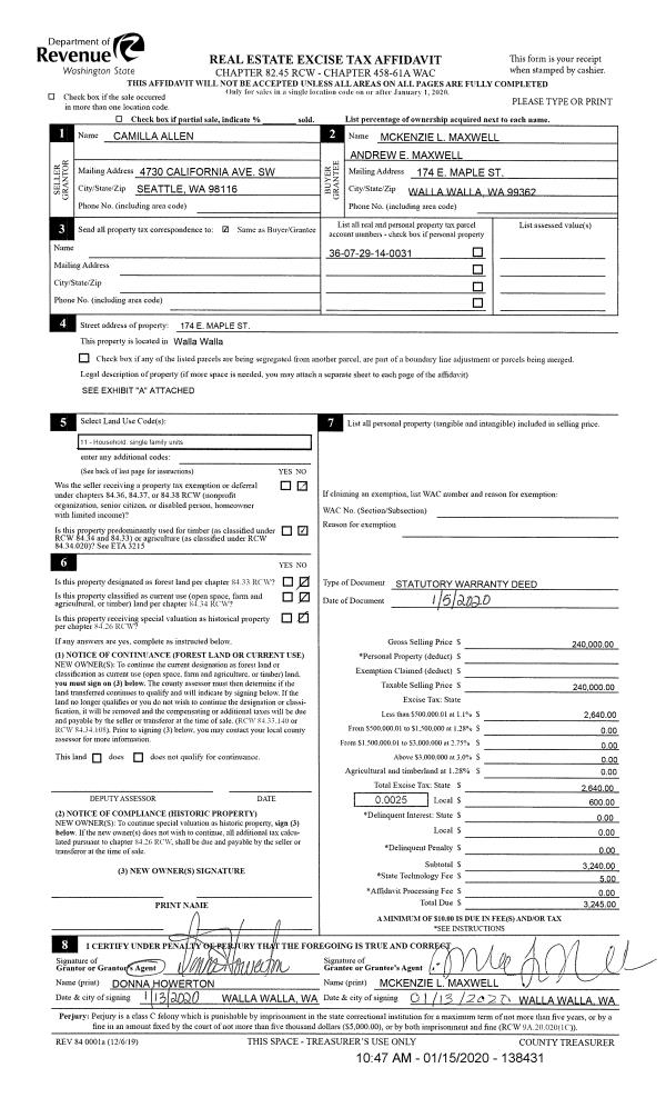 | 1 | 01/15/2020 | SWD | STATUTORY WARRANTY DEED | ALLEN CAMILLA | MAXWELL MCKENZIE L & ANDREW E | | | $240,000.00 | 138431 | 2020-00407 |