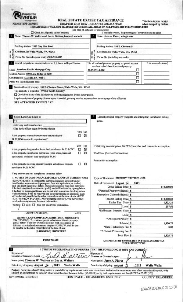 | 2 | 08/05/2013 | WARRANTY D | WARRANTY DEED | WALTERS, THOMAS W & LEE A | FLORES, JESSE A | | | $119,000.00 | 124408 | 2013-07953 |