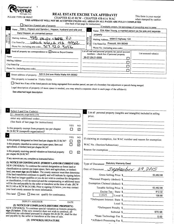 | 4 | 09/30/2015 | SWD | STATUTORY WARRANTY DEED | HOPSON DARYL L | YOUNG ERIK ALLEN | | | $63,463.00 | 128899 | 2015-08545 |