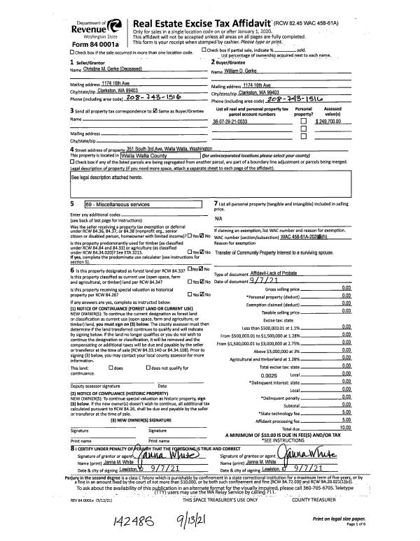 | 2 | 10/07/2021 | LOPA | LACK OF PROBATE AFFIDAVIT | GERKE WILLIAM D & CHRISTINE M | GERKE WILLIAM | | | $0.00 | 142485 | 2021-12214 |
