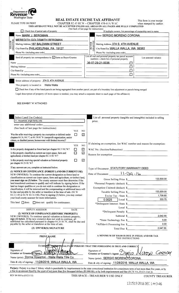 | 2 | 12/01/2016 | SWD | STATUTORY WARRANTY DEED | BERGMAN MARK J | CORONA SERGIO MORENO | | | $133,500.00 | 131519 | 2016-09846 |