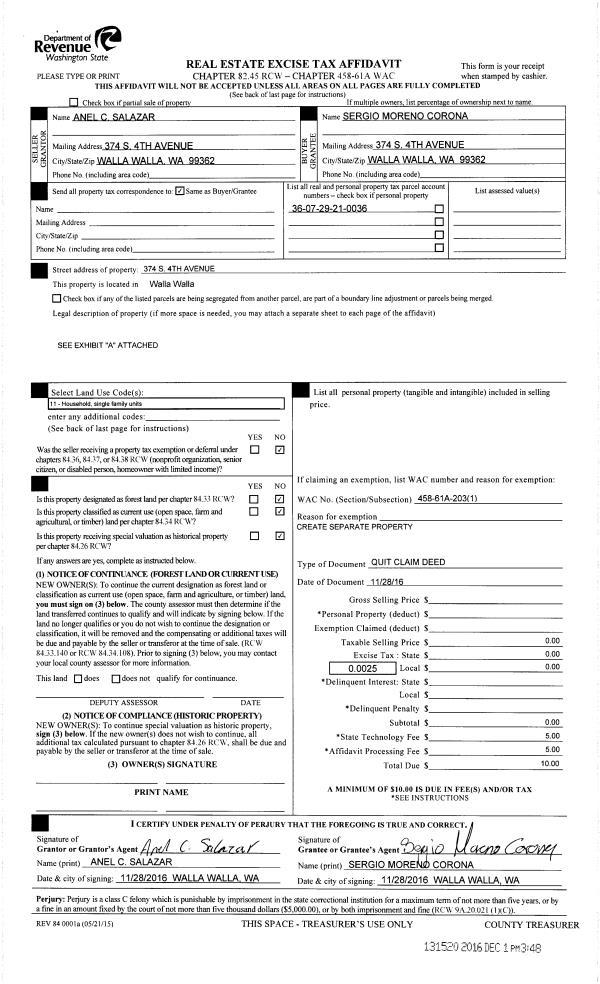 | 1 | 12/01/2016 | QCD | QUIT CLAIM DEED | SALAZAR ANEL C | CORONA SERGIO MORENO | | | | 131520 | 2016-09847 |
