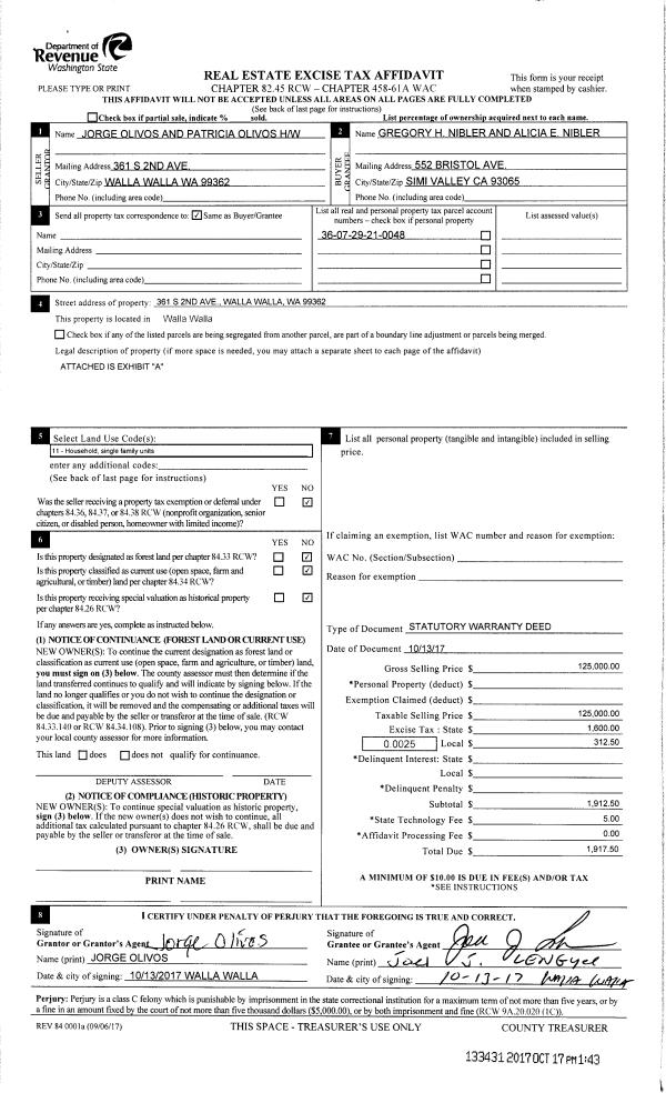| 1 | 10/17/2017 | SWD | STATUTORY WARRANTY DEED | OLIVOS JORGE & PATRICIA | NIBLER GREGORY H & ALICIA E | | | $125,000.00 | 133431 | 2017-08218 |