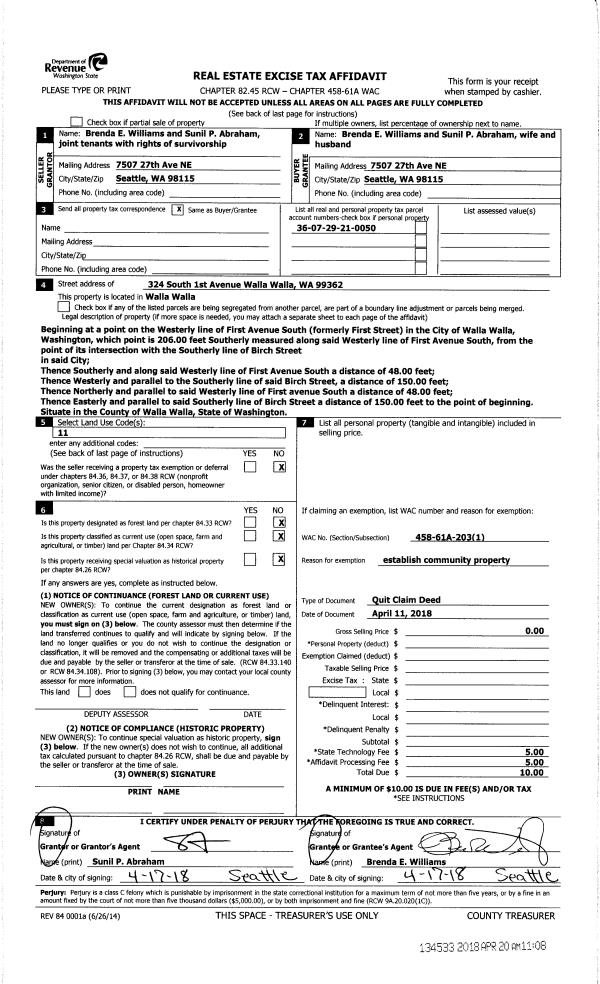 | 1 | 04/17/2018 | QCD | QUIT CLAIM DEED | WILLIAMS BRENDA E | WILLIAMS BRENDA E | | | $0.00 | 134533 | 2018-03087 |