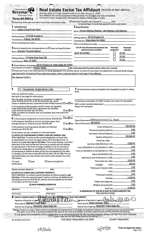 | 1 | 06/23/2021 | ADMD | ADMINISTRATOR'S DEED | SHORT SCOTT EMERY ESTATE OF | REBOLLAR HOMERO MARTINEZ & LIDIA | | | $320,000.00 | 141866 | 2021-07632 |