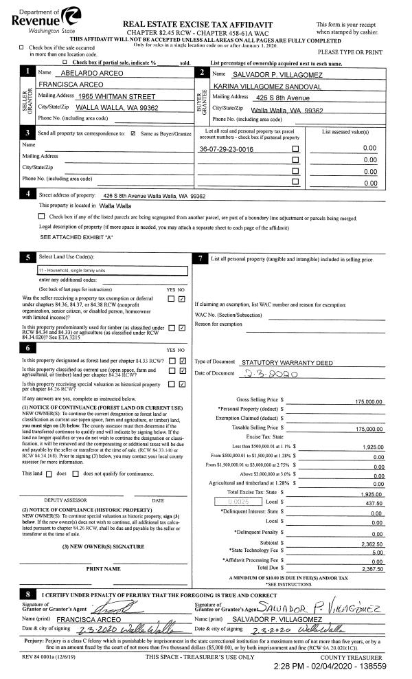 | 1 | 02/04/2020 | SWD | STATUTORY WARRANTY DEED | ARCEO ABELARDO & FRANCISCA | VILLAGOMEZ SALVADOR P | | | $175,000.00 | 138559 | 2020-01064 |